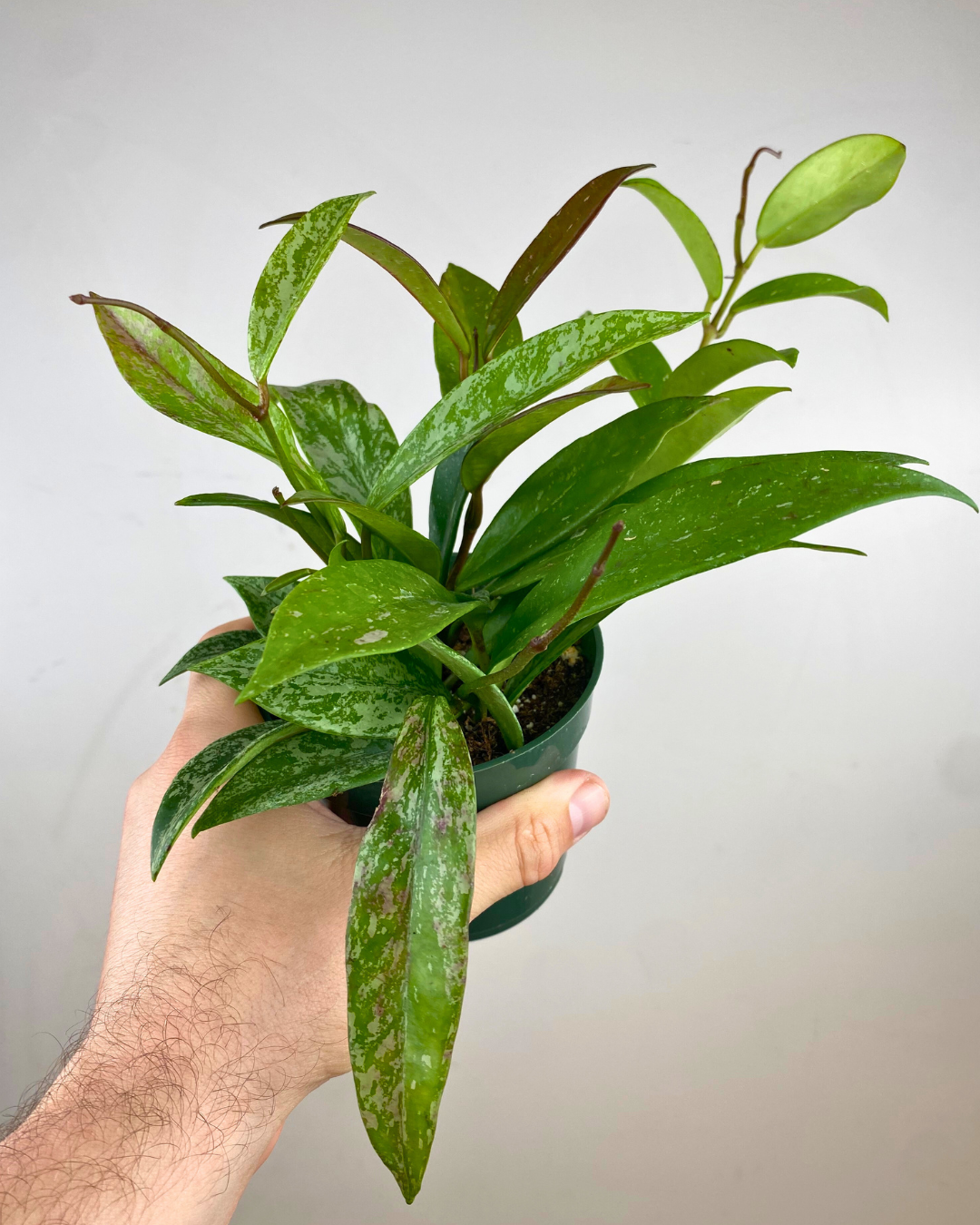 Hoya Publicalyx is one of the easy-care hoyas. Its leaves are very elongated and dotted with silvery spots.